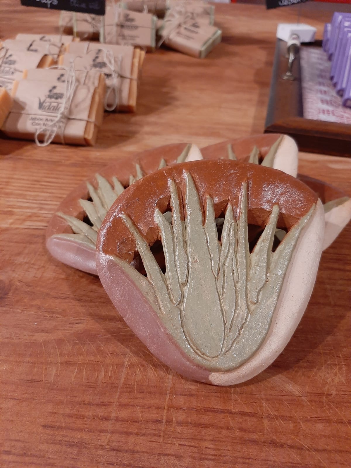 Porte-savon en céramique entièrement artisanal, élaboré dans le petit village de Tiscamanita (Fuerteventura), avec le dessin d’un exemplaire d’Aloe Vera.